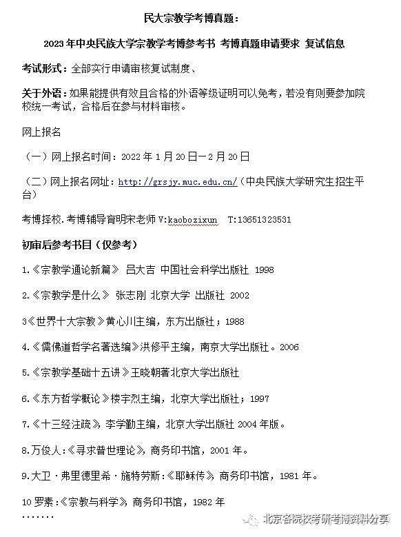 考博真题:2023年中央民族大学宗教学考博参考书 考博解析 复试信息